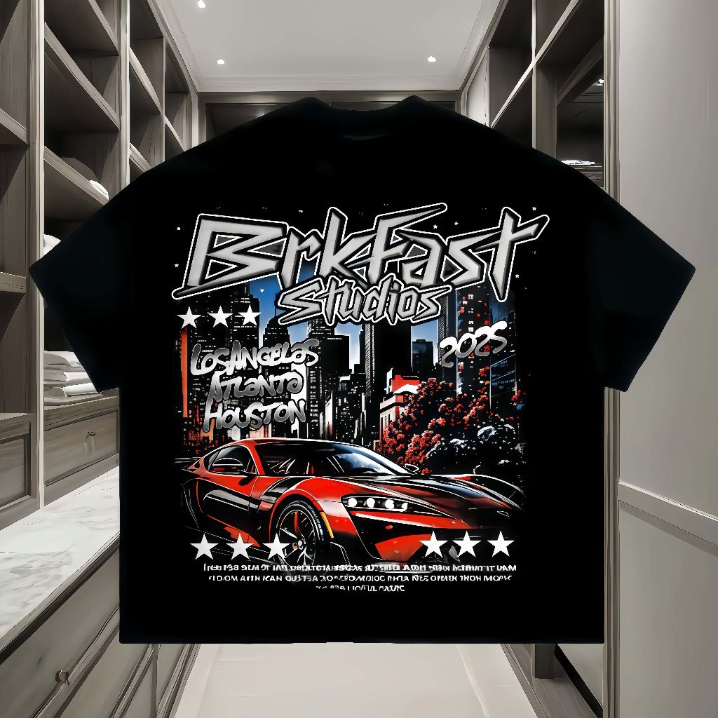 Giữa nhịp sống đô thị sôi động 🌆, chiếc áo thun màu đen này xuất hiện như một điểm nhấn mạnh mẽ dành cho những ai yêu phong cách dạo phố cá tính 👕🔥. Thiết kế nổi bật với hình in lớn ở mặt sau, kết hợp dòng chữ BrkFast Studios cùng hình ảnh xe thể thao màu đỏ 🚗💨 lao vút giữa khung cảnh thành phố về đêm, mang đến cảm giác tốc độ, tự do và hiện đại ✨.